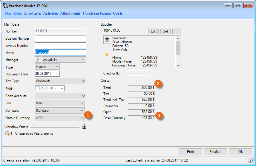 If you use the easyjob Controlling Center module, you can create Purchase Orders and Purchase Invoices also in the foreign currency . The costs are shown split up in the foreign currency , the total is shown additionally in the base currency