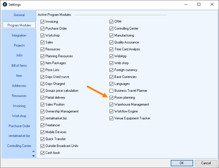 Go to the easyjob program settings to activate the easyjob Room Planner module: A separate installation is not required.