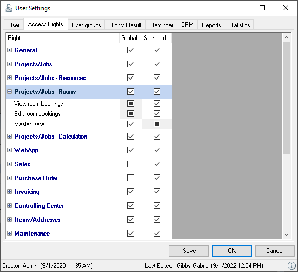 The rights for creating and editing the master data for Room Planning out are defined in the user settings.