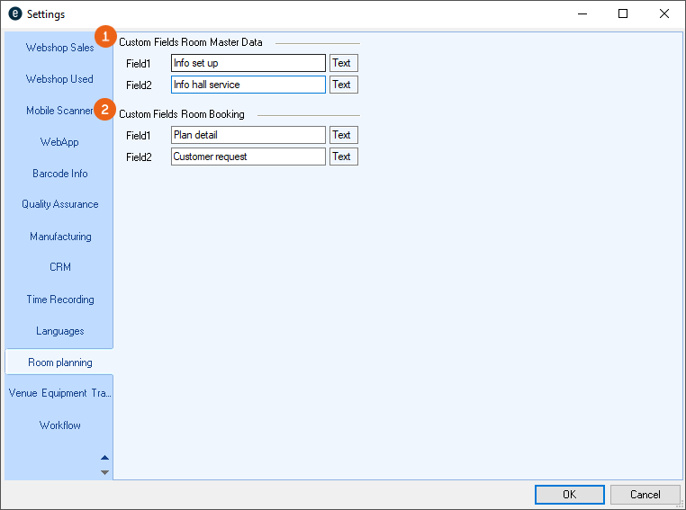 In the program settings, you can use two additional custom fields for the room master data and for the room booking . You can name the title and content to meet your needs and output the information in different reports (Proposed, Information for technicians, etc.).