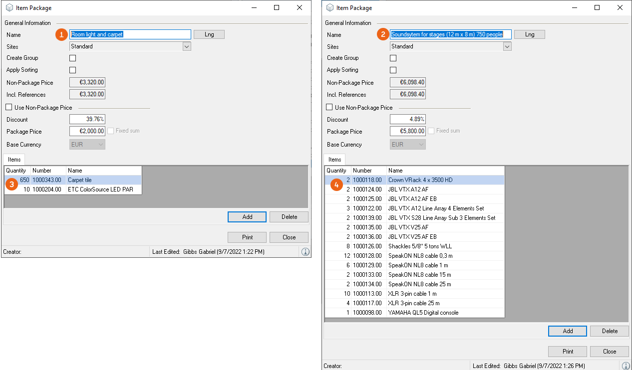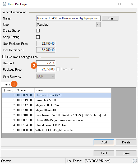2. Select an item package with Edit or create a new one with Add