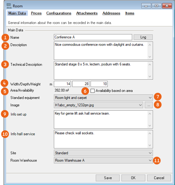 In the master data, you can first enter a Name , a general Description and a technical Description . easyjob uses the Dimensions to automatically calculate the Area . With Availability based on area checked, you specificy the basis for the availability calculation. You can assign standard equipment to the room. Standard equipment is an item package and can be created as required in the master data. In addition to an image or a plan, there are also two text fields you can use to describe the title and content. For information on how to change the title, refer to Defining custom fields. With Room Warehouse you define the items that are stored in the room. See also Creating and managing the room warehouse.