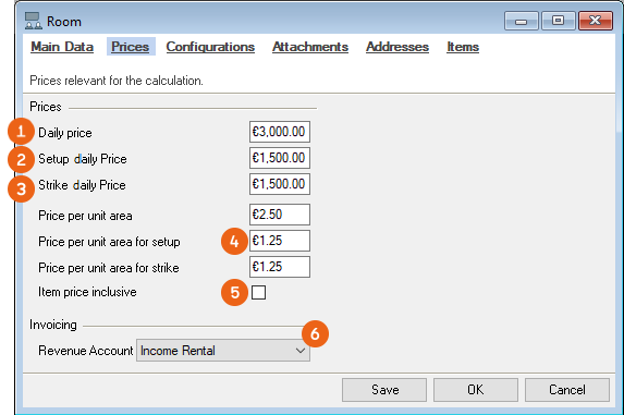 For the room, you can enter a Daily price as well a daily price for Setup and Strike . If you want to rent your booms based on an area unit , enter that price. By checking the Item price included box, all items booked in the item package of the standard equipment in the bill of items will be discounted 100 %. You can select a revenue account for invoicing.