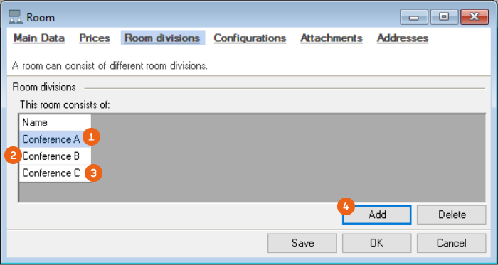 When you have created all rooms in the hall, which in our example are rooms A, B and C, create a new room with a name, such as Conference Max ABC or Total hall and assign the smallest units to this room under room divisions, using Add . See also Configuration.