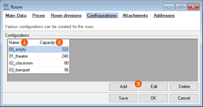 Under room configuration, define all the variants with which you want to rent your room. The overview shows you the Name and Capacity (number of persons) of the room with the various variants (e.g. seating). Add further details using Edit or Add . If you want your variants to always be displayed in the same order, number them.
