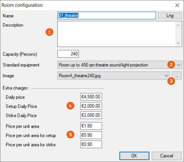 With Add or Edit you can define not only the name, description and capacity but also what the standard equipment should include for this rental variant (e.g. row seating with stage, sound, light and projection equipment). A Plan or Image can also be entered. Depending on if you are charging rent based on the Room or the Area , define the markups for the respective configurations.