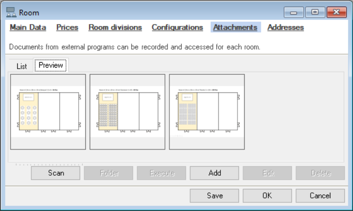 All documents added as an image or plan are displayed here in a list and as a preview. You can add additional information (e.g. hall arrangement, building plan, etc. as usual.