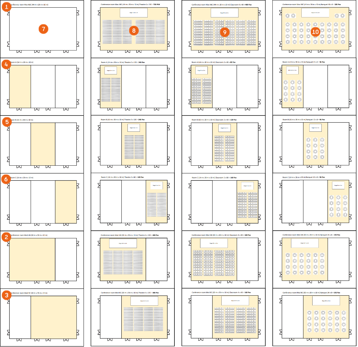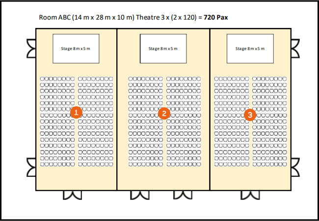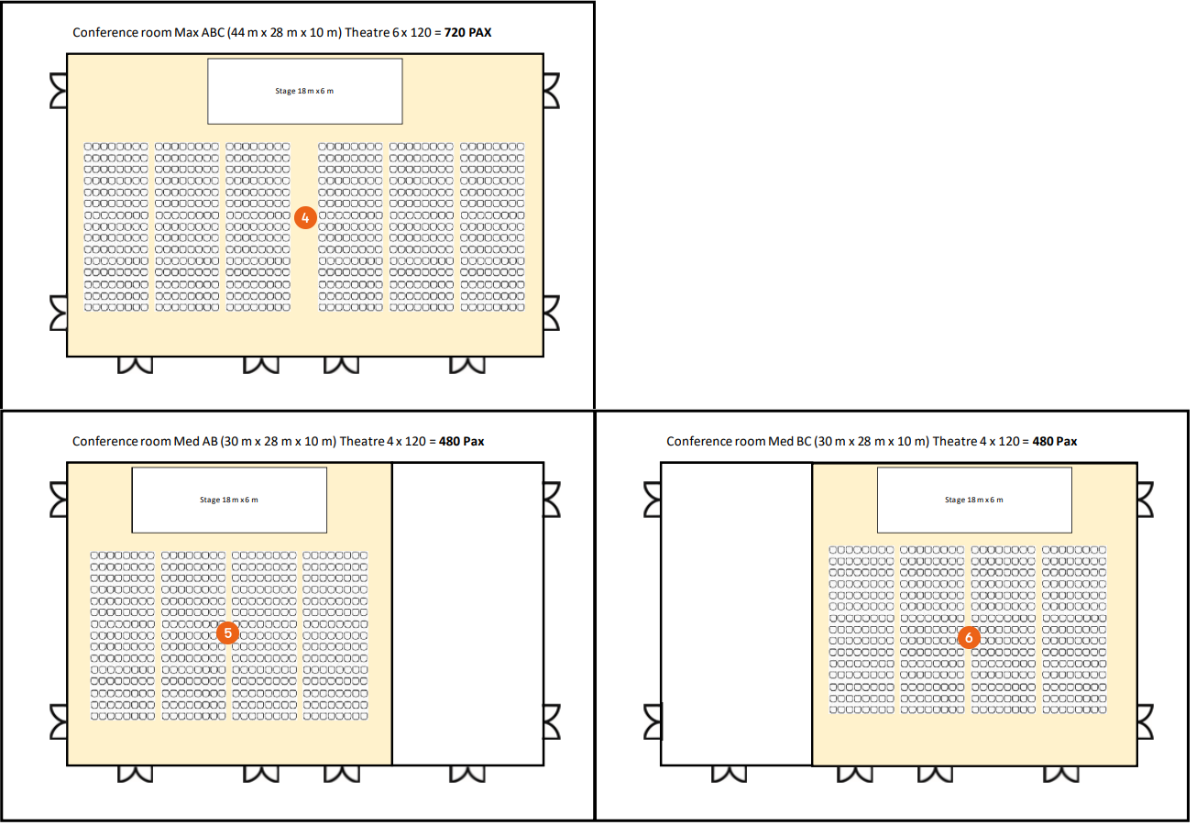 For a better understanding, the following example uses a hall that can be used completely as a 3/3 hall (Max ABC) , as a 2/3 hall (Med AB or Med BC ) or as a 1/3 hall (A , B or C ). Each hall size has different seating arrangements, e.g. empty , row seating (RB) , row seating with tables (AT) or seating around round tables (banquet) .