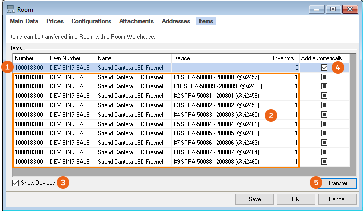 The view shows the items contained in the assigned room warehouse. You can control the view of the devices with Show Devices . By checking the Add automatically box the items of the room warehouse are added automatically to the bill of materials when the room is booked. If you have assigned a room warehouse to a room, you can transfer items (or devices) to the site of this room warehouse (see also Creating and managing the room warehouse).
