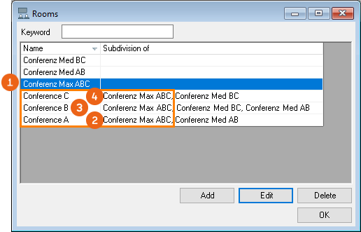 In addition to the individual rooms A, B and C, you can now create the rooms Max ABC , Conference Med AB and Conference Med BC in the master data.