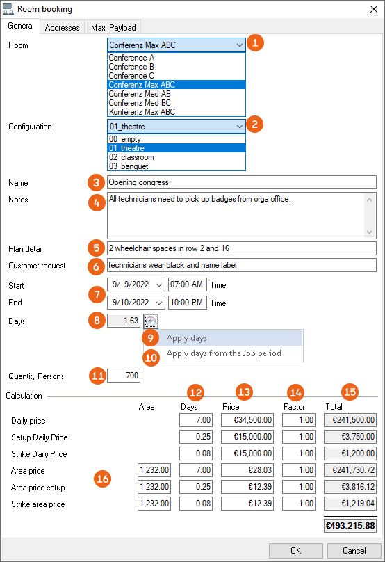 To book the desired room for a job, select the Room and the Configuration . Enter a Name and a Comment if necessary. You can rename the two free text fields, named Plan note and Customer request in the program settings Defining custom fields. Based on the Period easyjob converts hours into days , which can be used for the calculation . Alternatively, you can use the days from the Job period or enter them manually . You can also enter the number of People .