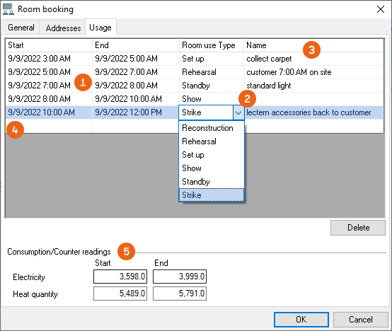 You can enter detailed Times that only concern this room on the Use tab. In addition to the Use type you can also enter a Comment . Click the empty line to add new lines. In addition you can record the consumption and the counter readings for electricity and heat.