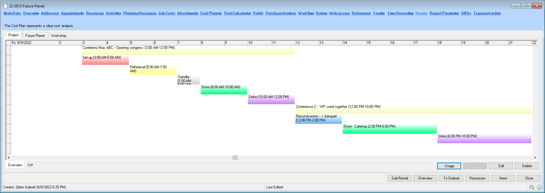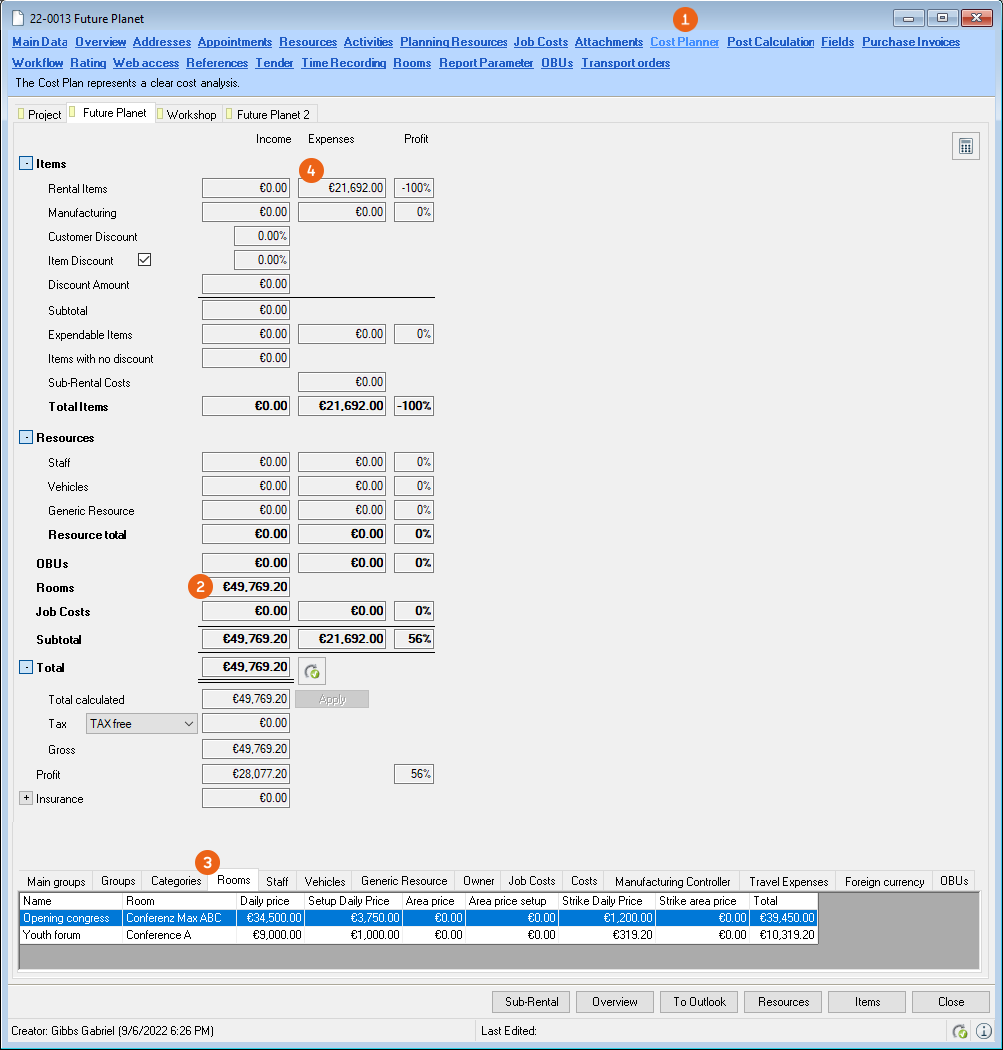 In the Cost Planner the prices for Rooms are summarized separately. The overview also shows how the prices are distributed over the individual rooms, daily price, set up, strike or area price. If you defined an item price as all inclusive, the items are discounted 100 % and the income for the rental items is € 0.00. See also Prices.