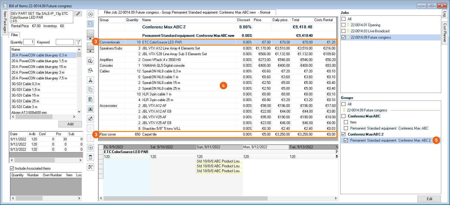 The standard equipment for a selected room (e.g. for Conference Max ABC Ceiling light and carpet tile room item package ) and the standard equipment for the selected configuration RB (e.g. item package Sound-Light-Projection ) is automatically booked when booking a room under the standard equipment item package: Conference Max ABC . If this room is used frequently for a job, it is numbered accordingly (in the example, standard equipment for Conference Max ABC 2).