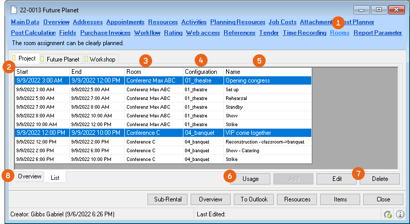 The easyjob Room Planner (RP) makes it possible for you to indicate, the specific requirements of your location with different spaces (divisible multi-purpose rooms or multipurpose halls with different standard equipment), to create, plan and calculate them with details (dimensions, types of use, etc.) It is also possible to define different room configurations (e.g. different seat arrangement and technical equipment) as well as enter different use times (e.g. setup, rehearsal, event, strike) for the rooms. You can see room availability at a glance graphically in order to avoid overbookings and to make best utilization of your rooms. You can directly invoice the room after the event.