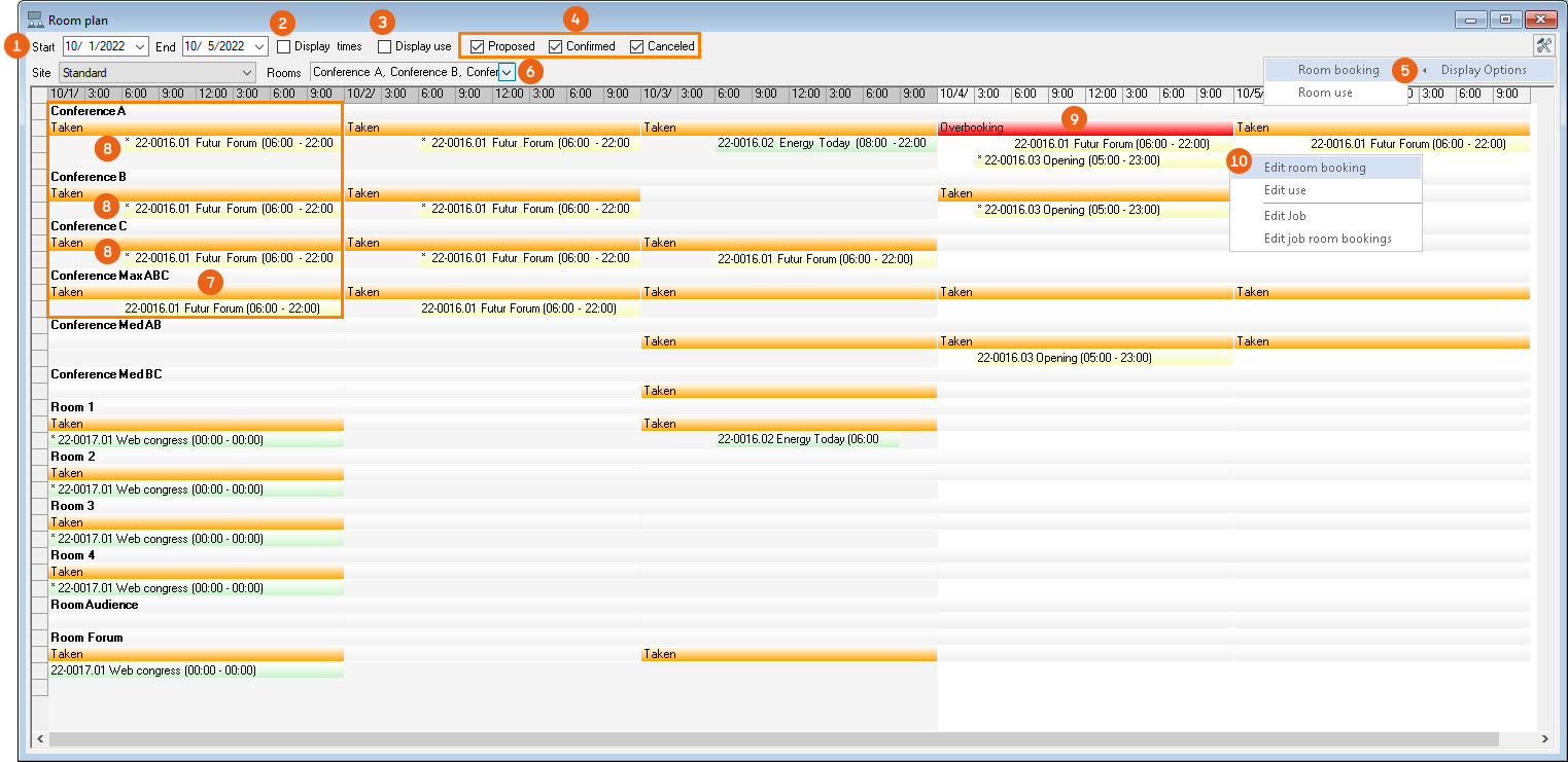 The room plan summarizes the occupancy of all rooms and their use times. You can select the Period of the view. In addition you can Display times , Display use , filter according to Job status , adapt the Display Options of the Room booking and Room use and show/hide the desired rooms . If a room (e.g. conference room Max ABC) is booked that contains multiple rooms, all concerned rooms are marked as Taken and the rooms that are also taken mandatorily are displayed with an asterisk before the job name . If the room is booked twice, an Overbooking warning appears. A context menumakes it possible to change the overbooked room or perform other actions.