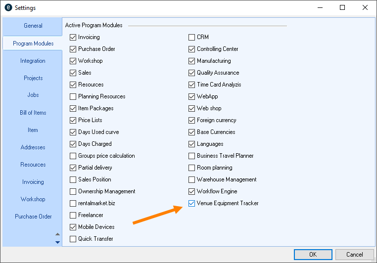 Go to the easyjob program settings to activate the easyjob Venue Equipment Tracker module. A separate installation is not required.