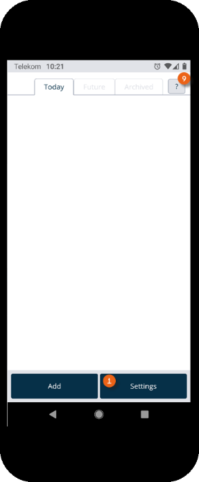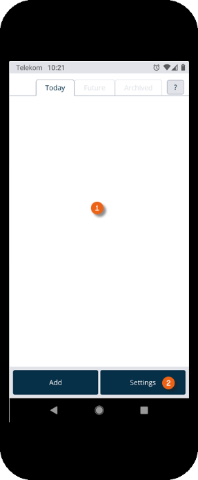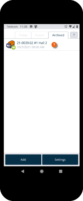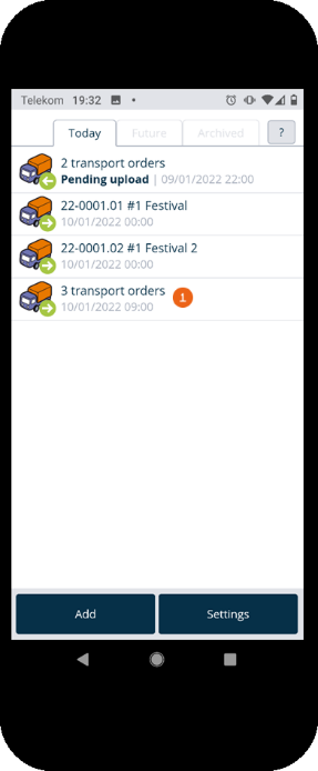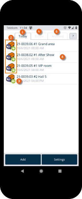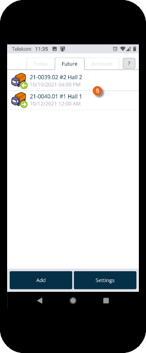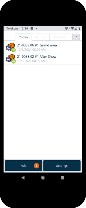 The home screen is displayed after the Equipment Tracker App is opened. It shows which transport orders are pending today . The green arrow to the right indicates a delivery, the left arrow indicates a pick-up. The Future tab shows future transport orders . The Archived tab shows completed orders . Tapping an entry opens the selected transport order.