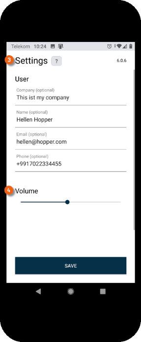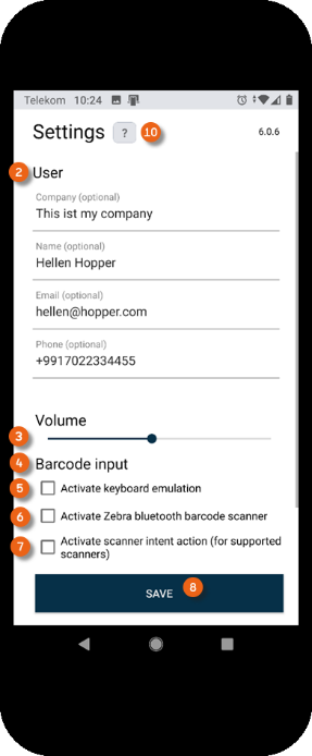 After downloading the app, you can open it and create your User profile under Settings . You can customize the volume of the confirmation beep. The various settings for the barcode input are explained in more detail in Scanner App manual. If you use the camera integrated in your smartphone, simply use the barcode, no other information must be entered. Then save your settings.