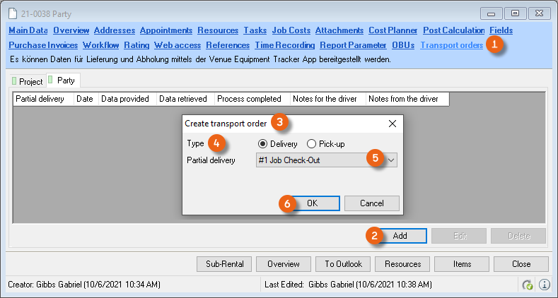 To do so, close the Bill of Items and open the Transport orders tab . Transport orders can only be created for confirmed jobs. Press add to create a new transport order . The type of transport order (delivery or pick-up), the concerned delivery (for a complete job without a partial delivery, this is identical to the Job Check-Out) must be selected and confirmed with OK .