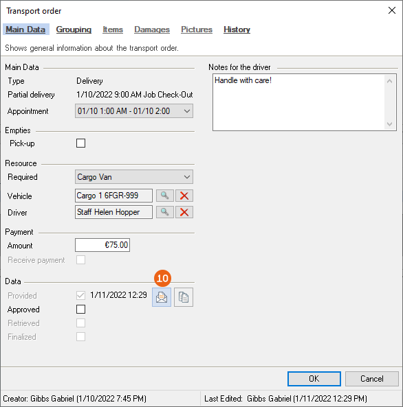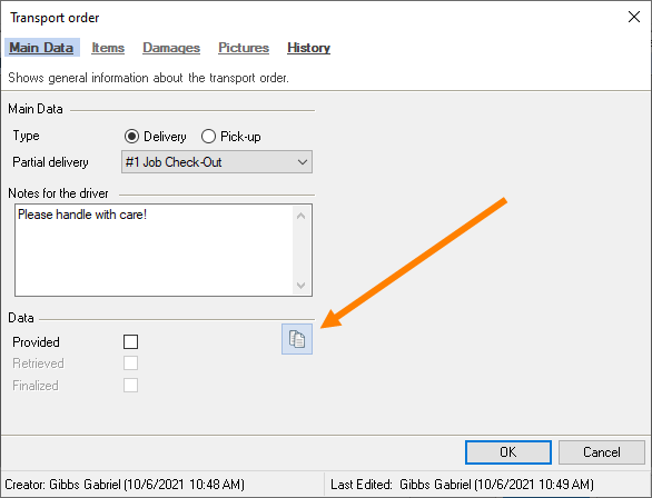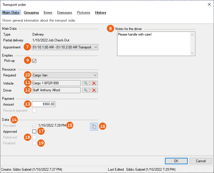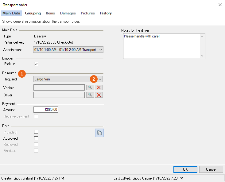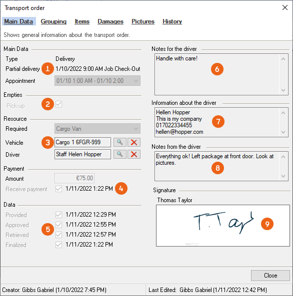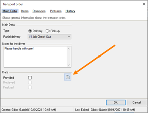 All relevant information about the transport order is displayed in the main data. In addition to the type (pick-up/delivery) and the concerned delivery or Partial delivery , you can see information about empties , resources and if a payment was due and if it was collected . The time of the order for the provision, approval, retrieval and finalize are shown under data . The notes communicated to the driver , the information about the driver provided in the Equipment Tracker App , the notes from the driver when finalizing the transport order and the digital signature are documented.