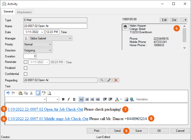 The CRM activity opens up and in addition to the Resource data it also contains a link for the Venue Equipment Tracker App of the respective transport order , in addition you can add information . You can send the e-mail directly by pressing Send .