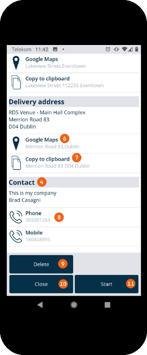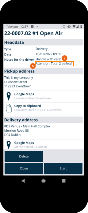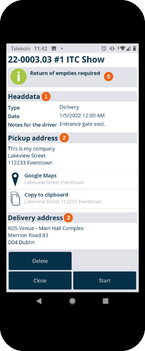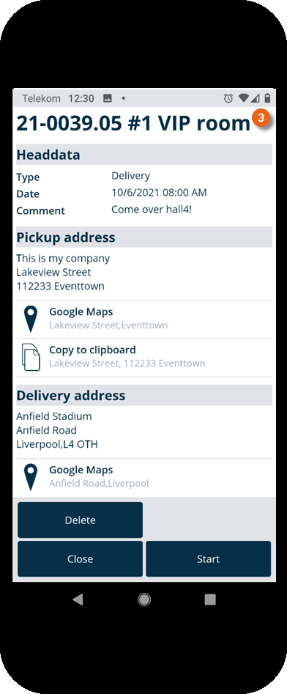 The order dates , the pick-up address , the delivery address and the contact (job manager) are displayed. If empties are to be picked up, the corresponding note appears. The addresses can be opened directly in Google Maps or copied to the clipboard . By tapping the telephone number it is called directly by your end device. You can Delete the transport order completely.