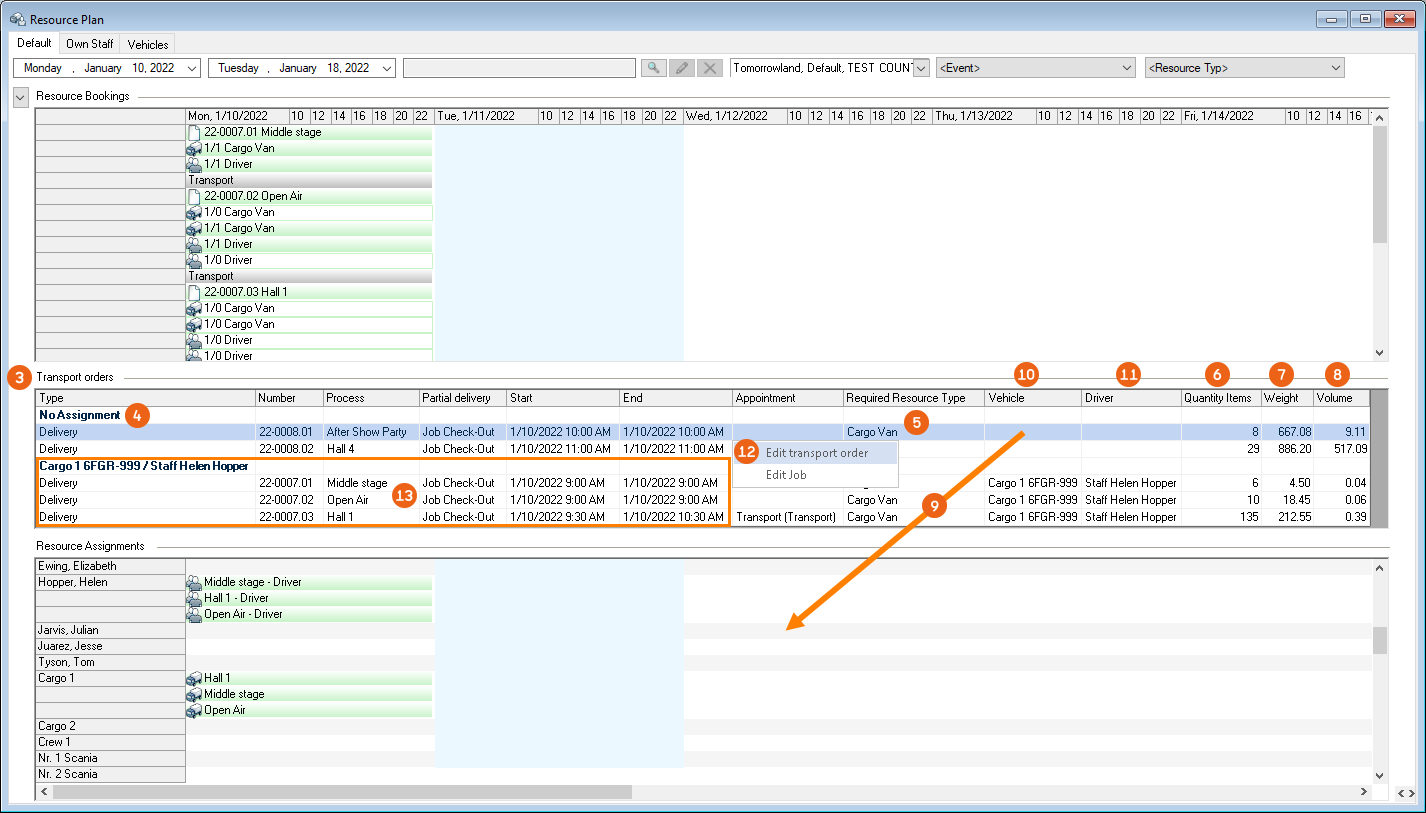 The resource plan helps you summarize the transport orders, if necessary, and assign a vehicle and driver . If items are to be delivered to or picked up from the same delivery address, the transport orders can also be grouped for the driver in the Venue Equipment Tracker App. See also Grouping.