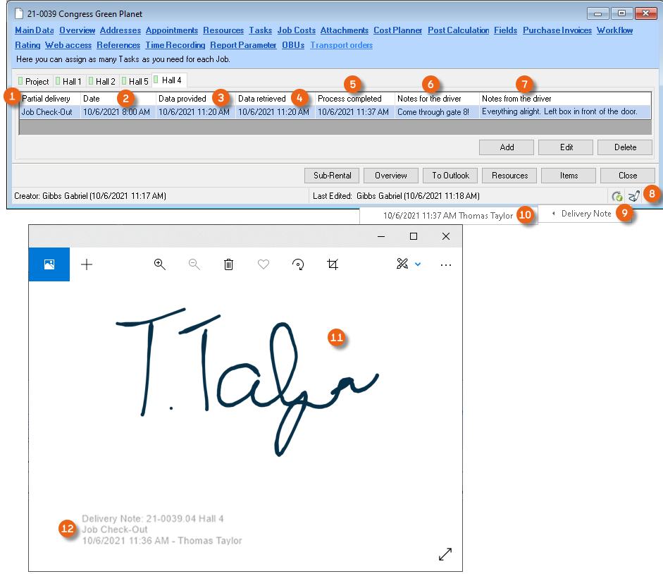 , the required Delivery Note can be selected and opened . The signature is displayed and, in addition, a stamp for the data relevant for the delivery is included in the signature image.