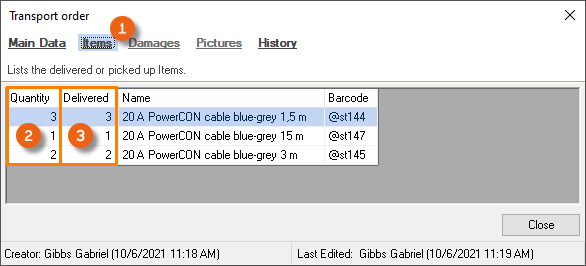 Under Items , all items/devices are displayed that are available in the transport order with an indication if they are scanned as delivered (or picked-up) .