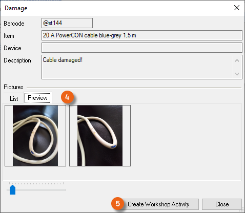 The pictures taken in the Venue Equipment Tracker App of the damage are displayed in the damage documentation. You can create a Workshop Activity directly from here.