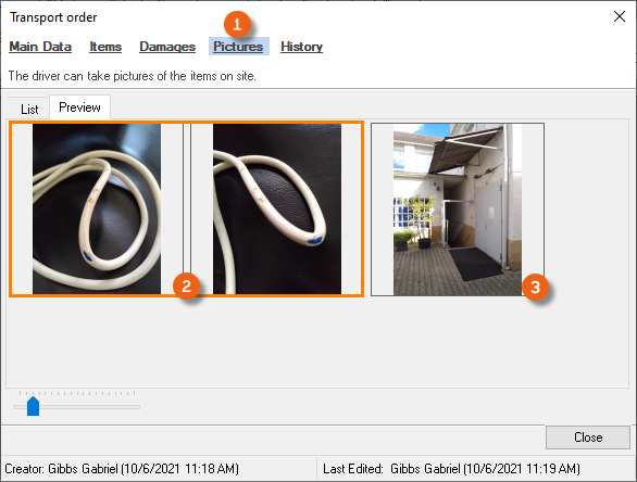 The Pictures section contains all the pictures created for this order in the Venue Equipment Tracker App, all pictures of the damage the pictures taken directly using the Pictures function, e.g. to document the delivery location .