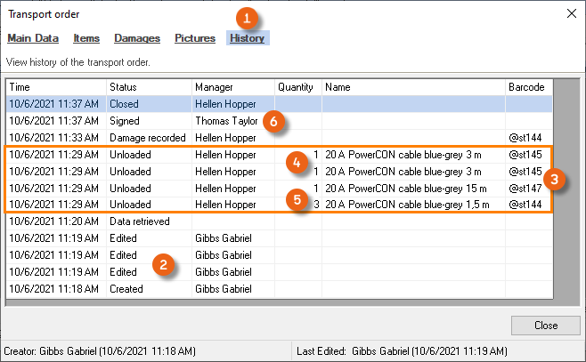 The History shows the log entries for the transport order. In addition to the information in the Master Data, such as when the data was created, provided, approved, retrieved and finalized , a detailed list of the scanning process is displayed here. You can see if the items/devices were scanned individually or if the quantity was first entered and then the item scanned only once. If there is no entry in the Barcode column, the Item was not scanned or confirmed directly in the App. The time of the signature and the entered name are also displayed .