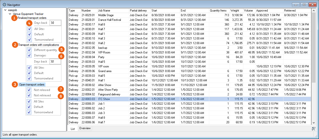 The views Finalized transport orders , Open transport orders and Transport orders with complications are available in Navigator and easyjob Today. Depending on the view, you can use additional filters such as Days back , Different quantity , Damages , Not released or Not retrieved .