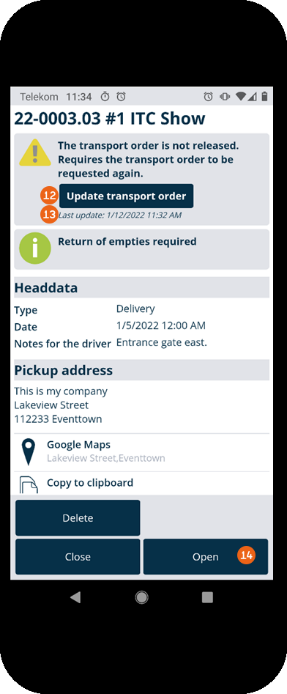Please note that the content of the transport orders is created only for loaded items and devices. Items and devices that have not yet been loaded are not shown in the Equipment Tracker App. In that case, only the order data (pick-up address, et.) is provided.