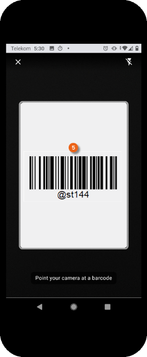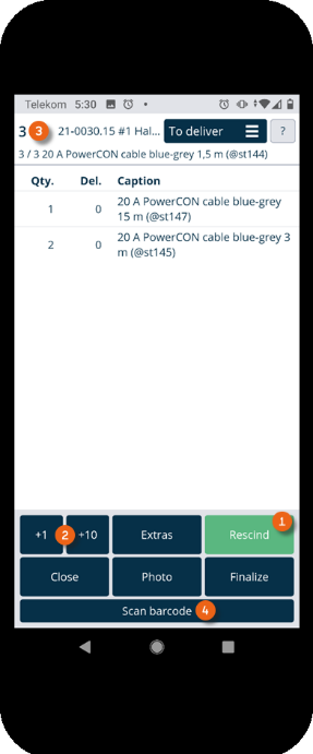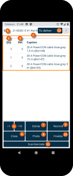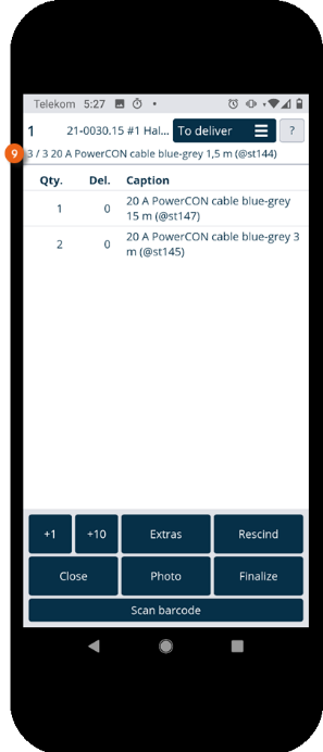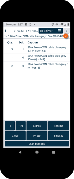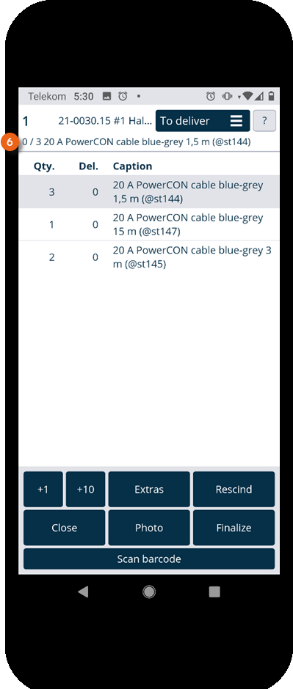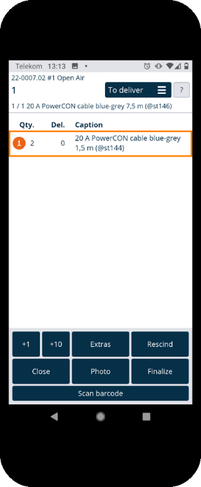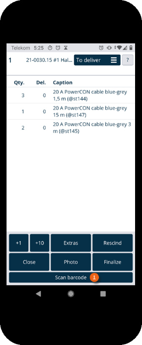 There are two possibilities for scanning items. You can scan all items in sequence (regardless of the order) until no more items are shown in the To deliver view. To do so, tap Scan barcode and then start scanning . The currently scanned item is also shown in the view . Repeat Scan barcode until all items have been scanned.