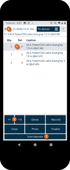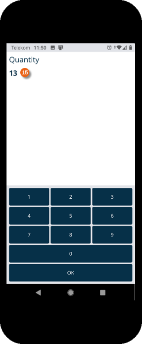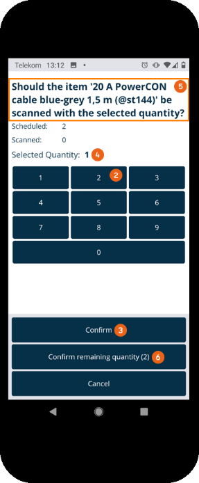 Alternatively, you can also deliver items without scanning the item barcode, e.g. when the barcode is not available or the camera is not functioning. To do so, tap the item you want to deliver for at least 2 seconds. A numeric display appears you can use to enter and confirm the quantity to deliver . When the correctly selected quantity is displayed, you can confirm the query if you want to scan the item with the selected quantity . Alternatively you can directly confirm the remaining quantity . The item and the entered quantity are marked as delivered.