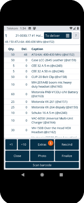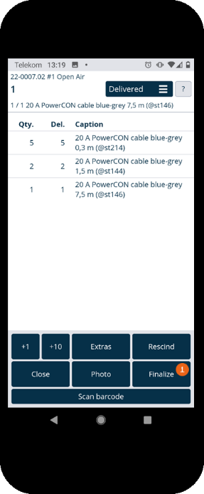 Alternatively, you can enter the quantity of items to scan all at once. To do so, tap the concerned item and increase the quantity with the +1/+10 buttons. Then tap Scan barcode and scan the barcode . The selected quantity is shown as delivered .