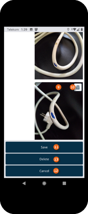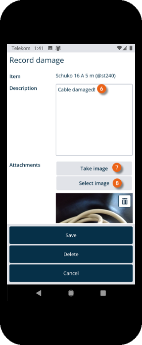 To document the damage, you can add a description take a picture or select an existing image . You can add multiple images or delete them . When finished, save the recorded damage. You can also cancel damaging recording or delete the process .