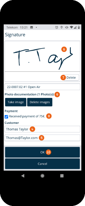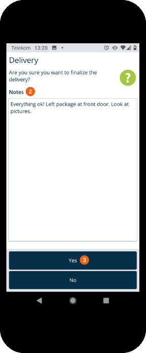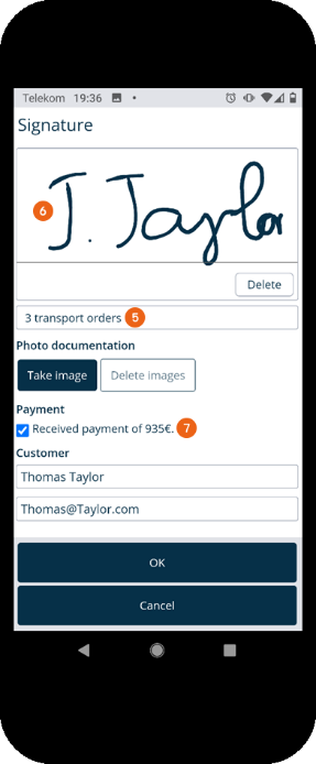 After recording all items, you can Finalize the transport order. You can also add Notes before finalizing the delivery with Yes . You now have the possibility to enter the name and e-mail address of the recipient and let them sign digitally . In case of a failed attempt, the digital signature field can be deleted . If a payment must be made, the receipt of payment is specified here. Alternatively you can provide photo documentation to document that the delivery was made, and where, if no one was there to receive it. Press OK to start the data transfer.