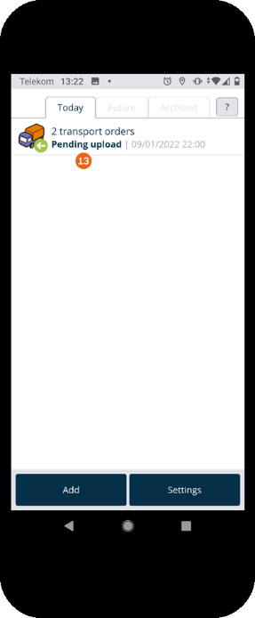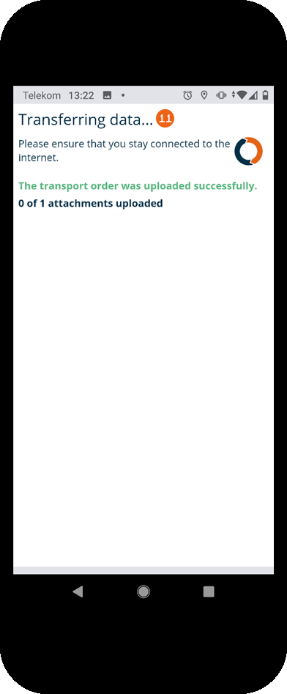 An Internet connection is required for the data transfer . A status message is displayed that shows which data was already uploaded. After the data was transferred successfully, a Final message is displayed. If a transport order cannot be transferred, it remains on the start screen with the message Pending upload . It can be opened and uploaded again.