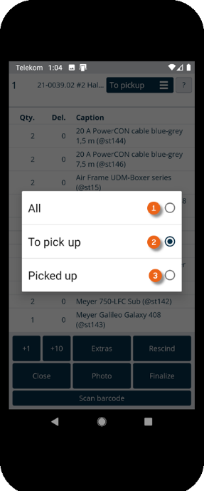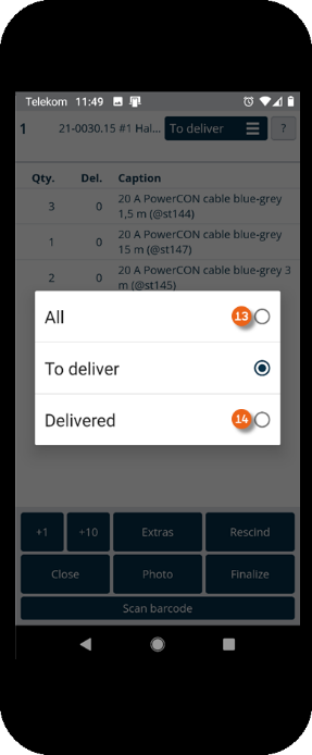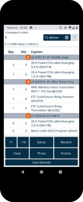 As soon as you have started a transport order, an overview of its items and the respective quantities is shown. You can also see how often the item was already scanned. With +1 and +10 you can preallocate the quantity of items to be scanned. for example if you want to deliver 13 of the same item, you can tap 2 x +10 and 3 x +1, the number of the item to be scanned changes from 1 to 13 and the barcode for the 13 items must only be scanned once. Alternatively you can tap directly on the quantity and change the number directly . You can close the order if necessary (already scanned items remain saved). With Extras you can record damage or add additional Pictures to your transport order for documentation purposes (e.g. the deposit location). Items marked accidentally as delivered can be canceled and finalized at the end of the transport order. With Scan barcode you can activate the camera to start scanning. Depending on the complexity of the order, you can switch the view from To deliver to All or Delivered .