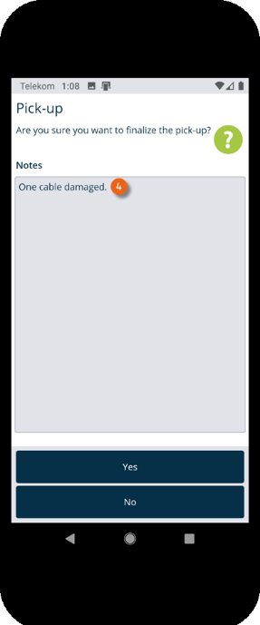 In the Equipment Tracker App, a pick-up functions as the delivery. The view can be switched between All , To pick up and Picked up . When finalizing the transport order, you can add Notes . See also Delivering items from a transport order. The recipient data and the digital signature are omitted.