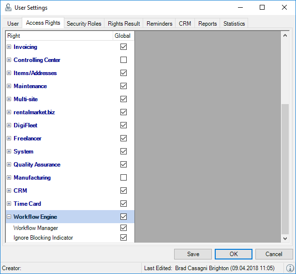 The right to use the Workflow Engine is defined in the user settings.