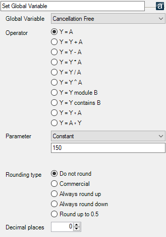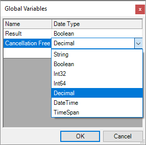 | Global Variables | You can create Global Variables yourself from the following datatypes - Boolean, String, Int32, Int64, Decimal, DateTime or TimeSpan |