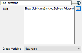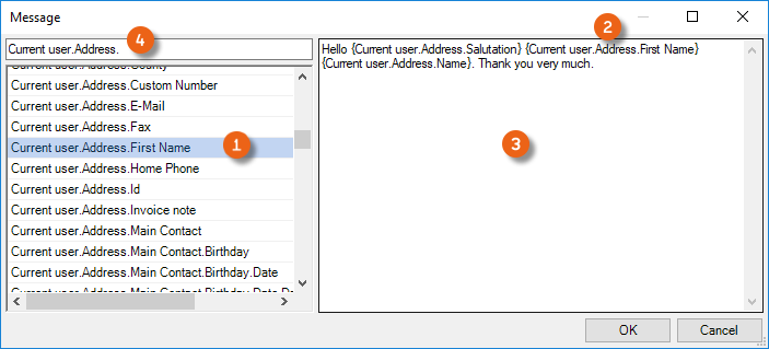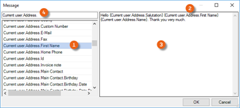 you are able to create texts with individual variables (which are then filled during execution). After opening the window, you can select from the variables that are available and Drag&Drop them to the text window. Additionally, you can create free texts in the Window and integrate your desired variables (e.g. Project name, etc.) in the text. To make editing easier, a Filter is available for the variables.