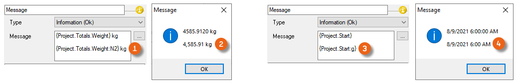 Variables that contain numbers or a date can be displayed formatted with an addition. With numbers, for example, with :N2 the thousand separation and the display with two decimal places take place. With a date format, the addition :g , hides the seconds .