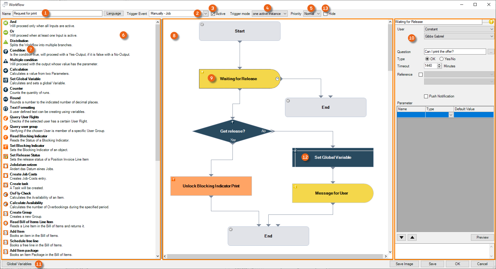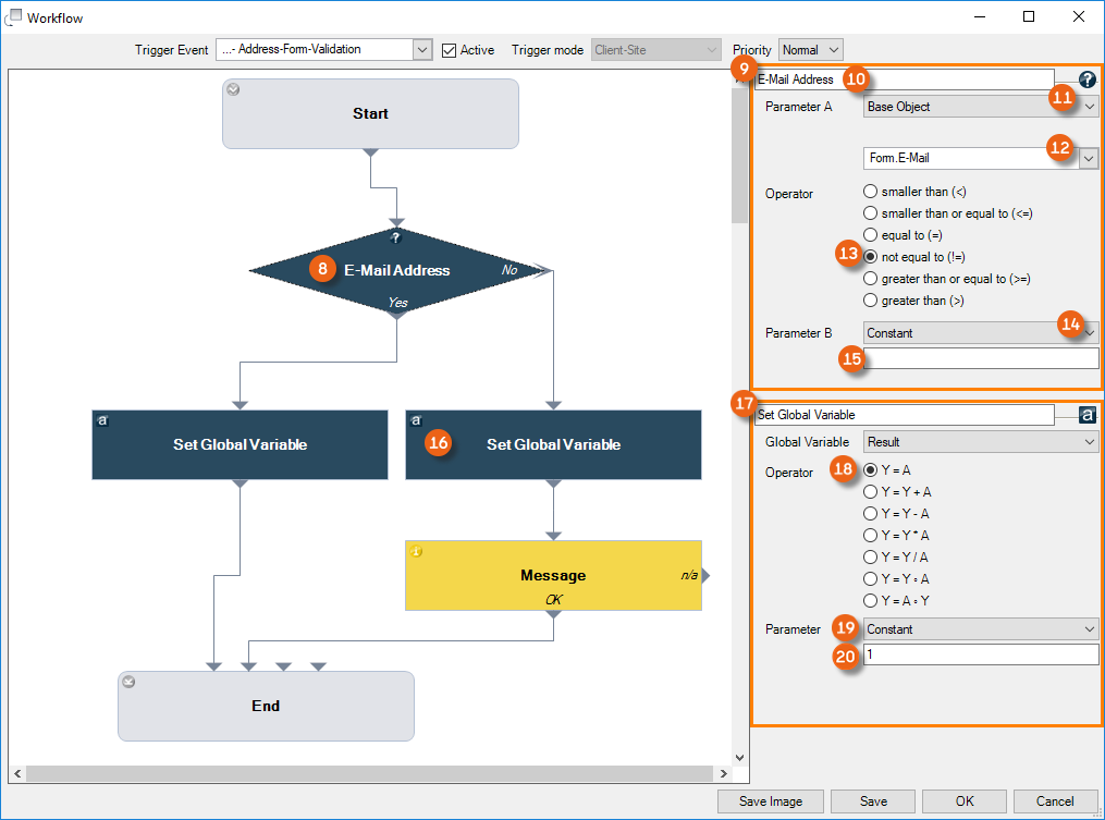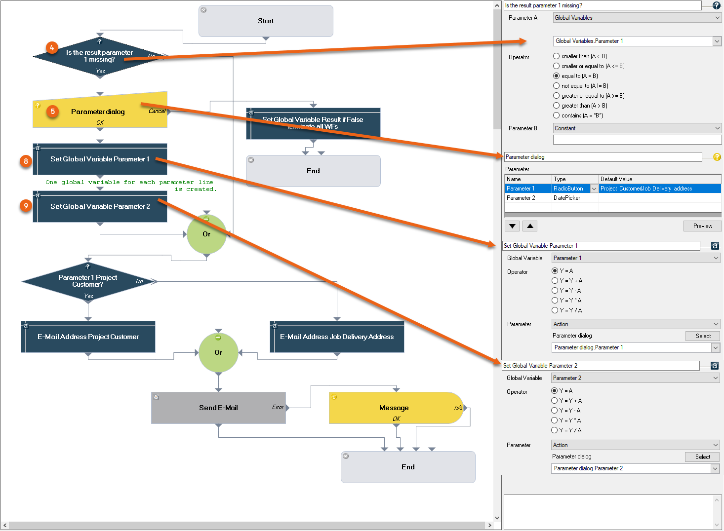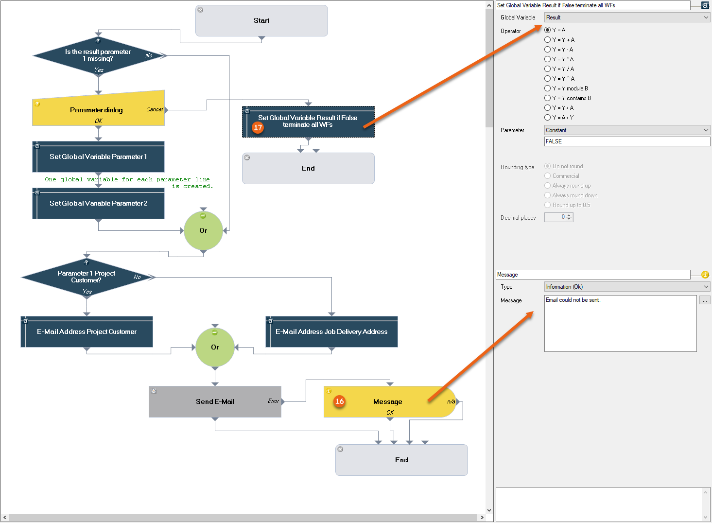 20. To directly end the following workflow if the parameter dialog cancels the workflow, set the Global Variable Result in this point to 'False'.