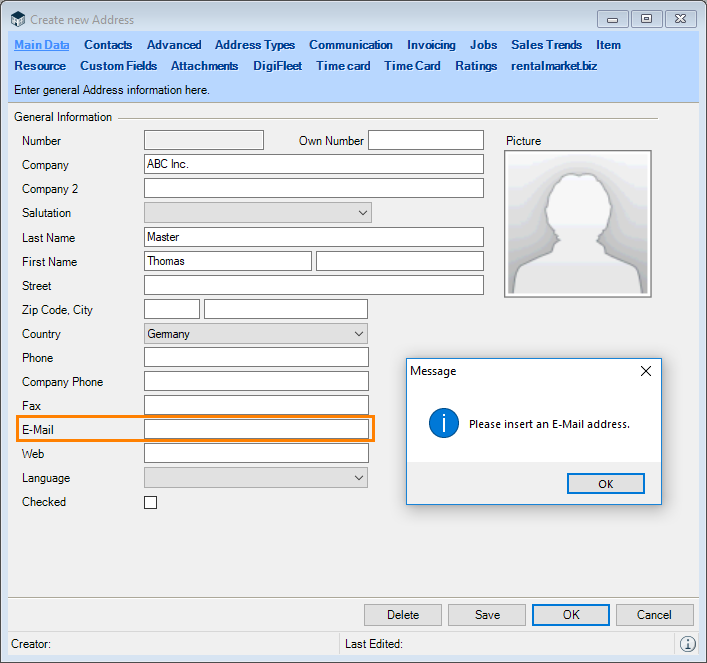 Description: When creating a new Address, the entry can only be saved if an e-mail address is entered.
