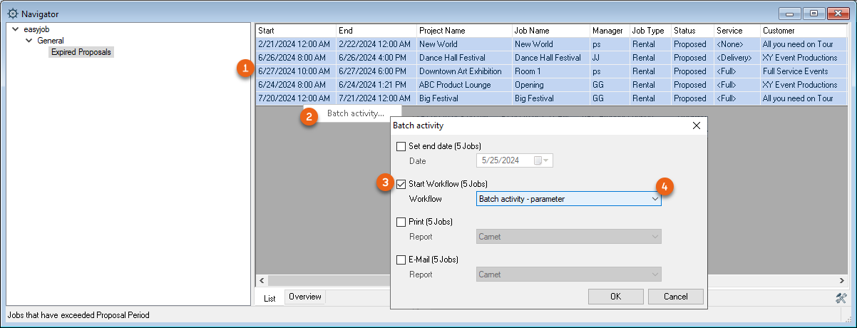 With a batch activity, you can select multiple easyjob processes (e.g Jobs in the Navigator view) in order to to start the same workflow for all selected processes. By right clicking with the mouse, the menu for Batch activity is started. Check the box for Start workflow and select the desired Workflow .